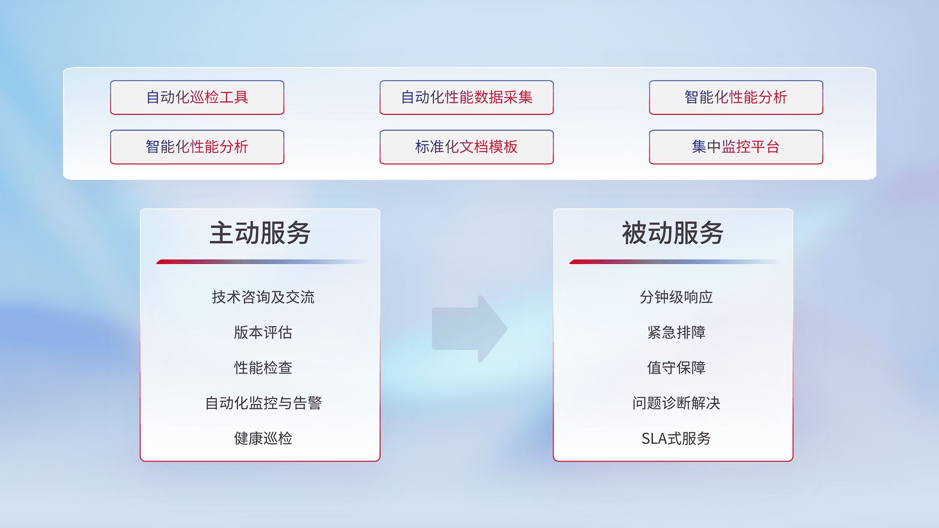 智能化工具和标准化文档,,保障服务质量,,提供主动服务(包含技术咨询、、、版本评估、、性能检查、、自动化监控与告警、、、、健康巡检)和被动服务包含(分钟级响应、、、、紧急排障、、、值守保障、、、问题诊断解决、、SLA服务)。。