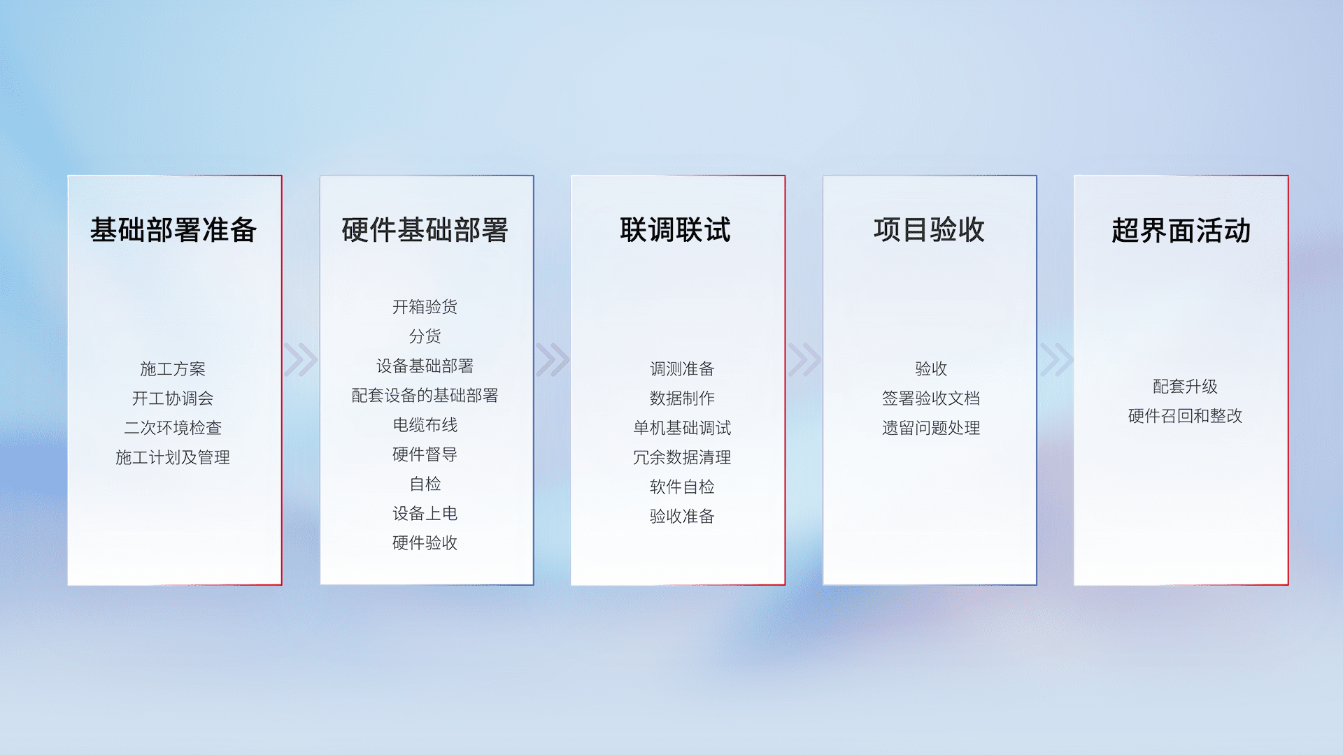 从基础部署准备、、、硬件基础部署、、、联调联试、、、项目验收、、、越界面活动的全过程可追溯,,,,保证施工质量和进度。。。。